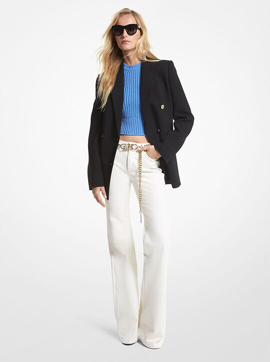 يقدم هذا الجينز الدنيم مجموعة من خيارات التصميم. لقد تم تصميمها بشكل شاهق ومتوهج يتم تحديده بشكل أكبر من خلال حزام مصقول على شكل سلسلة. قم بموازنة قطع إمباير الجريئة للحزام مع قطع منفصلة أنيقة.