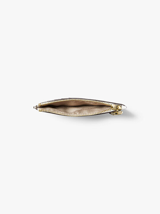 يُعد هذا الطراز الرفيع المصقول والعملي بديلاً راقيًا لحافظات البطاقات التقليدية. مزيّن بقطع معدنية ذهبية اللون لإضفاء لمسة من التألق، وهو مصنوع من الجلد الناعم مع لوحة أمامية منسوجة ويتميز بجيب خارجي لبطاقاتك، في حين توفر المقصورة الداخلية المثبتة بسحاب مساحة تخزين إضافية للعملات المعدنية والنقود. ضعها في حقيبتك المفضلة.