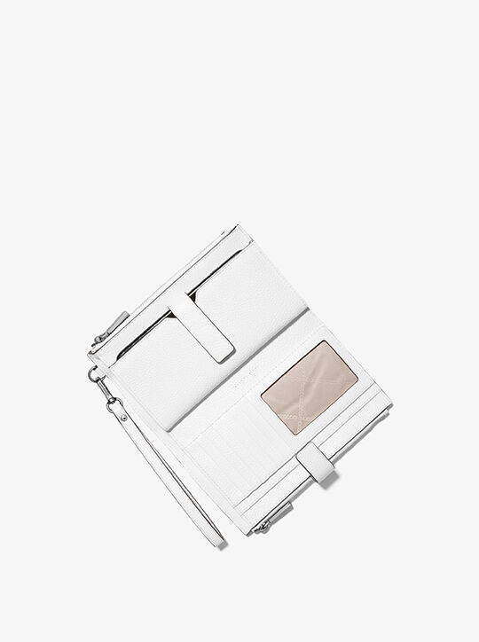صُنعت هذه المحفظة الأنيقة من جلد محبب غني لتحافظ على مظهرها الخالد، ولها جانبان بسحّاب ينفتحان ليكشفا عن مركز به جيوب لجميع الضروريات، من بطاقات الائتمان إلى هاتفك الذكي. كما يعمل حزام المعصم على إضفاء لمسة من التنوع عليها، بحيث يمكن حملها بمفردها أو في حقيبة يد.