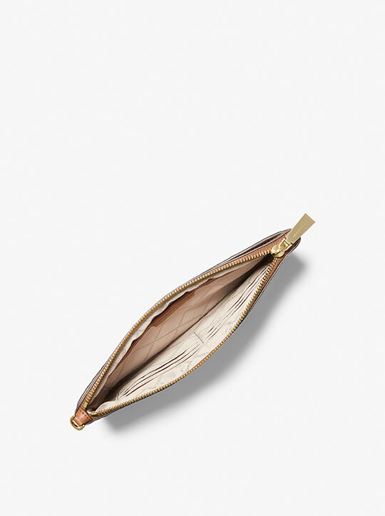 سيحافظ هذا المعصم الأنيق على ضرورياتك في متناول اليد. صنعت الحقيبة من قماش كلاسيكي بنقشة مميزة وتتميز بسحاب للإغلاق بمساحة داخلية واسعة وجيب مفتوح وفتحات واسعة للبطاقات. احمليها بمفردها من الحمالة الجلدية الناعمة عندما تريدين السفر بخفة ، أو ضعيها في الحقيبة المنسقة.