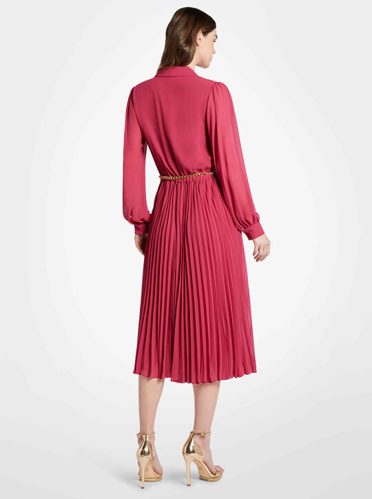 Designed with a crossover neckline and point collar, this polished yet effortless dress features an elastic waistband which descends into a pleated skirt. Finished with a gold-tone chain-link belt, it makes a glamorous statement for day and night.