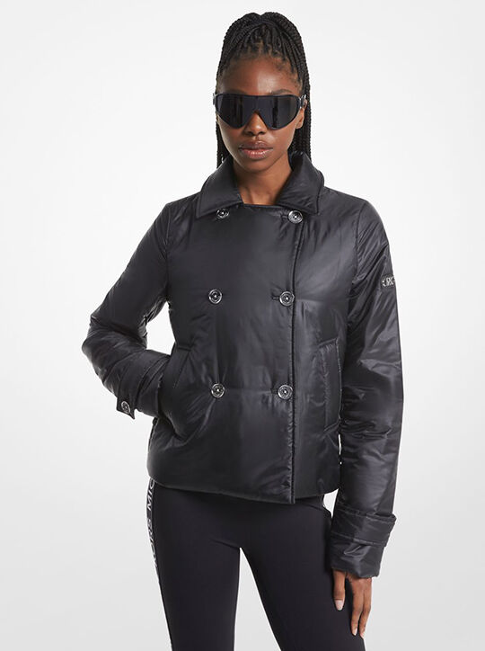 Look cool while keeping warm with this sporty spin on a classic peacoat. Made from recycled satin ciré, the double-breasted silhouette is padded for comfort and finished with a pointed collar. Silver-tone hardware and logo-embossed buttons add a final hint of shine.