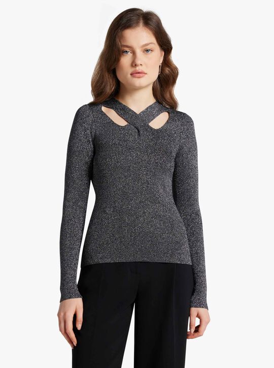 Made from metallic knit for subtle shine, this fitted sweater will add a fashion-forward touch to everyday looks. It features a cutout neckline with crossover straps for added flair. Wear it best with a pair of jeans and a quilted handbag.