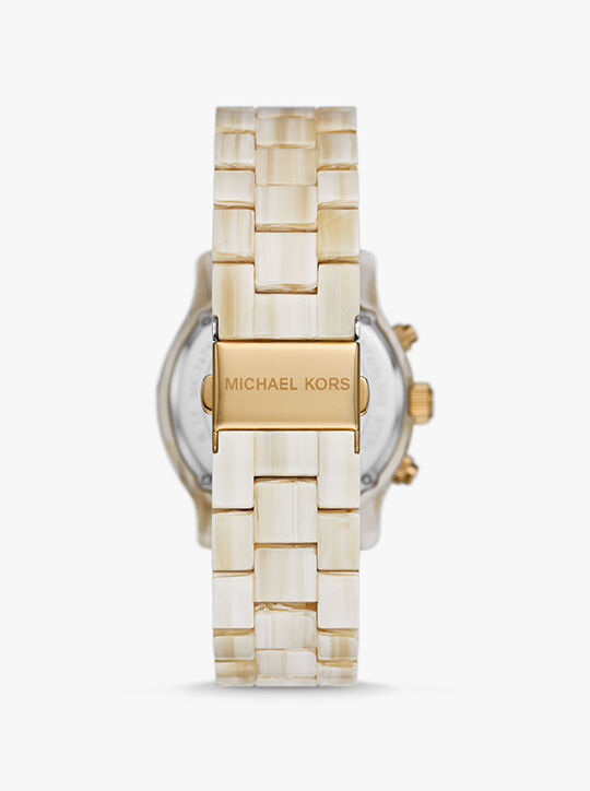 The perfect finishing touch to every outfit, our new Runway watch will be a favorite for years to come. Updated with raised sub dials, this dazzling style is crafted from gold-tone stainless steel and versatile, alabaster-hued acetate with a pavé-embellished bezel, and features chronograph details for precise timekeeping.